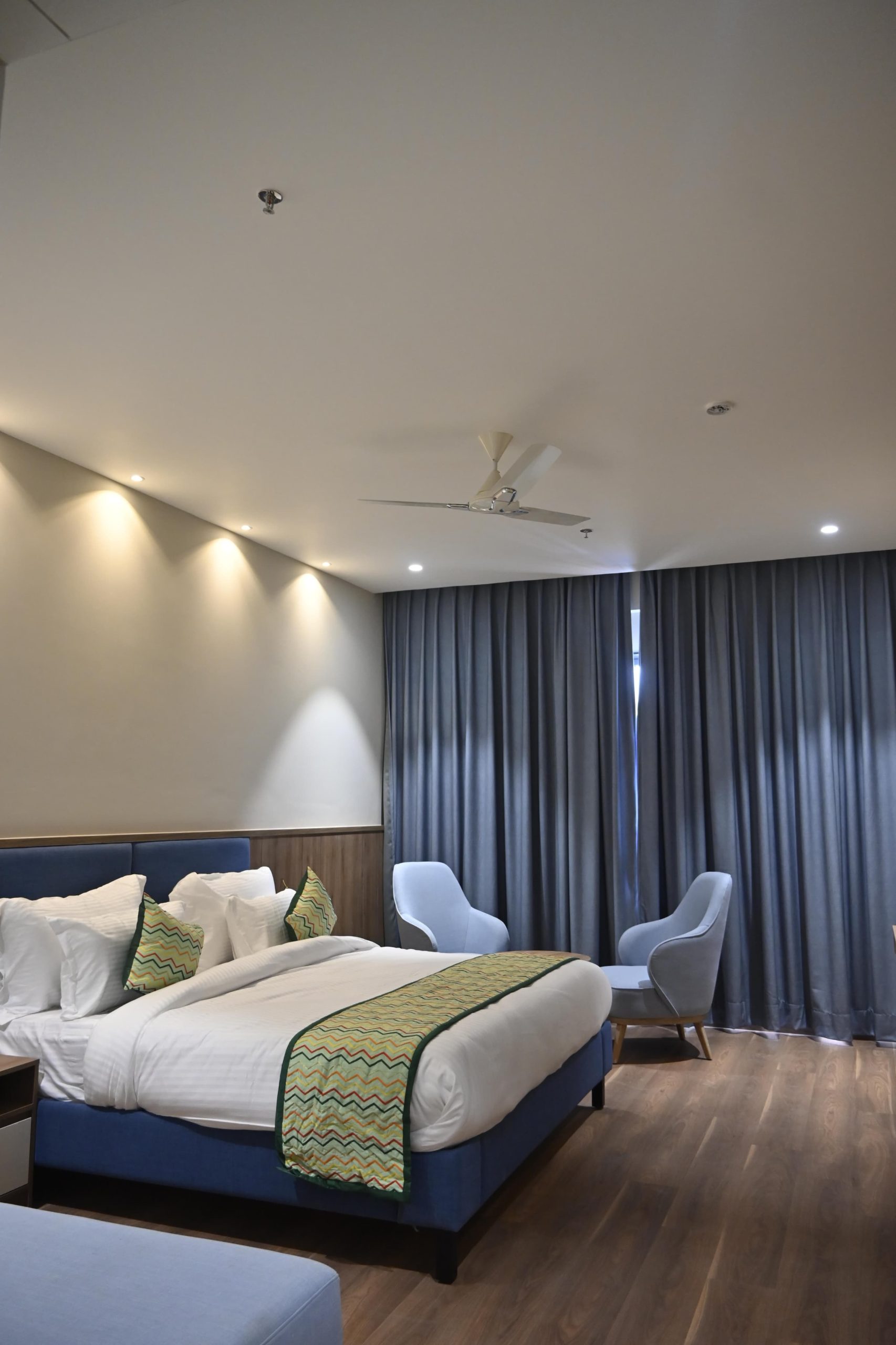 With two inviting lounge chairs and a stylish study chair, relaxation and productivity harmonize effortlessly. Immerse yourself in modern convenience with a well-appointed mini fridge and other amenities, promising a stay of utmost indulgence. Complete with a cozy king bed, our Super Deluxe Room accommodates up to three guests, providing a sanctuary of sophistication and relaxation.